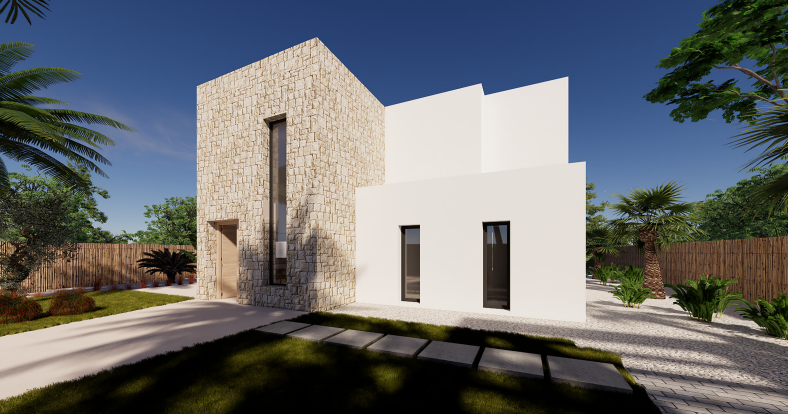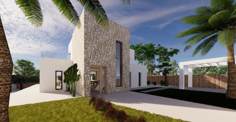 Wygląd zewnętrzny został zaprojektowany tak, aby w pełni cieszyć się śródziemnomorskim klimatem i stylem życia. Dom ma zadaszoną werandę, duże tarasy, solarium i elegancki basen bez krawędzi, który jest wizualnie zintegrowany z krajobrazem. Z przodu działki znajduje się parking z pergolą dla dwóch pojazdów.