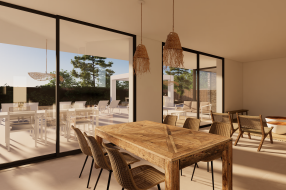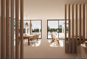 Willa ma nowoczesną i współczesną estetykę, z wysokiej jakości materiałami i wykończeniami. Jest wyposażona w ogrzewanie podłogowe i system klimatyzacji, gwarantując komfort przez cały rok. Porcelanowe podłogi, zewnętrzna stolarka aluminiowa i detale z kamienia naturalnego na elewacji dodają charakteru, trwałości i ponadczasowego designu.