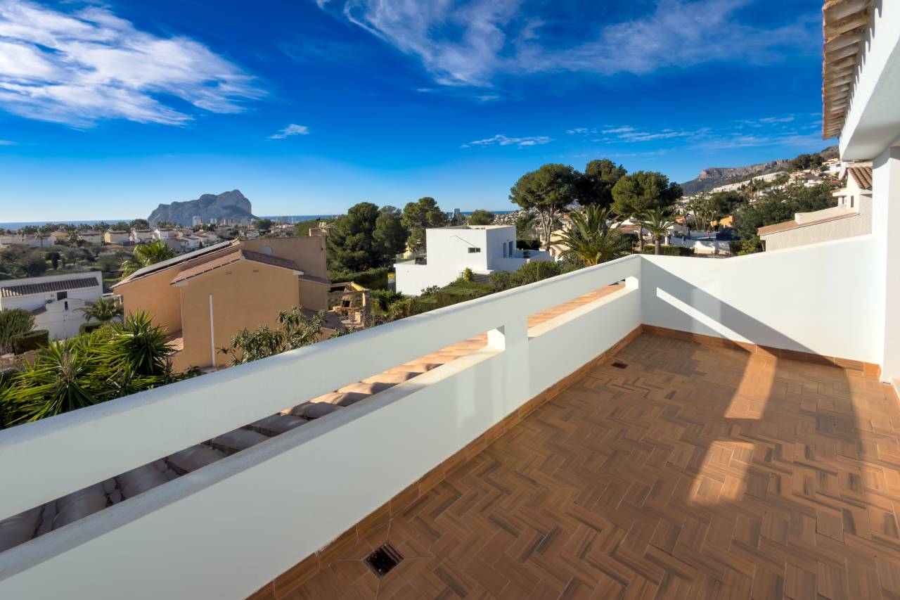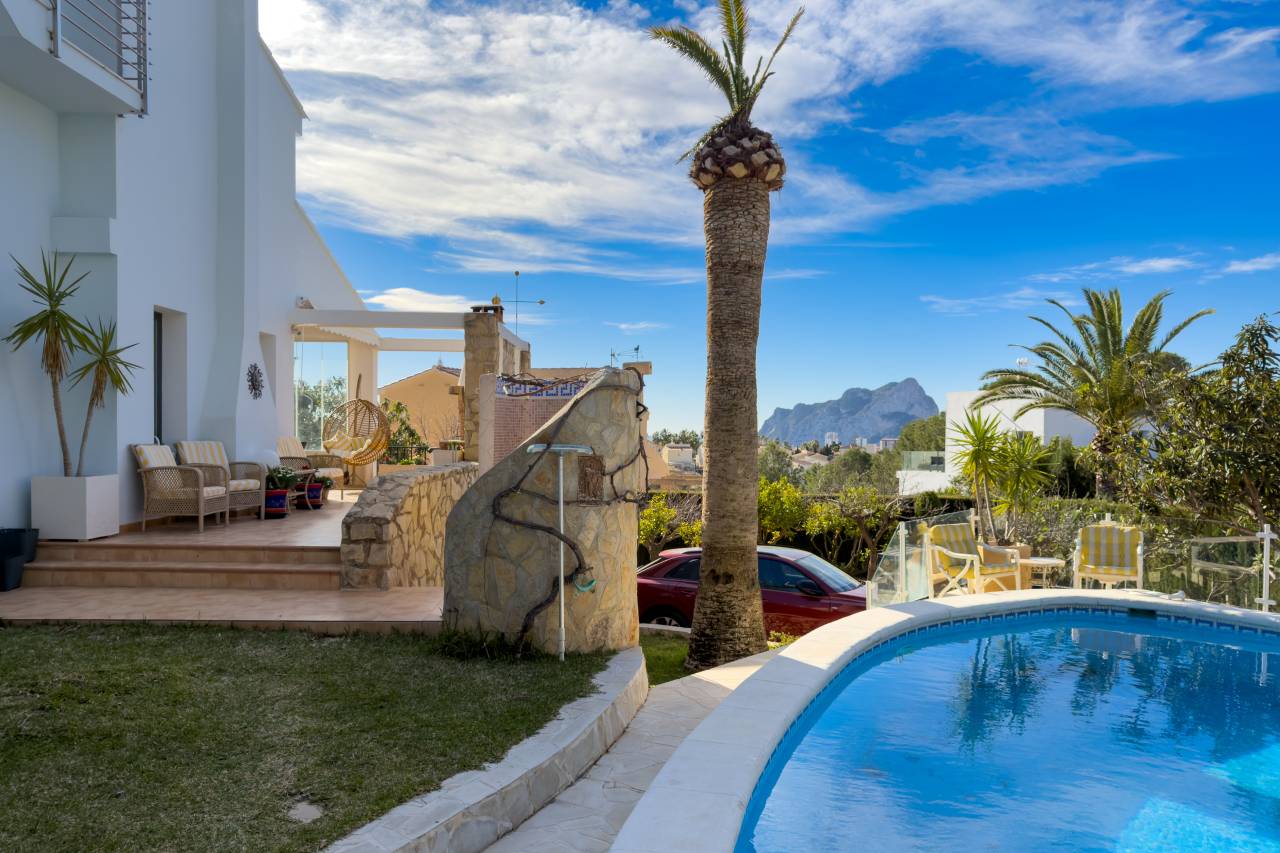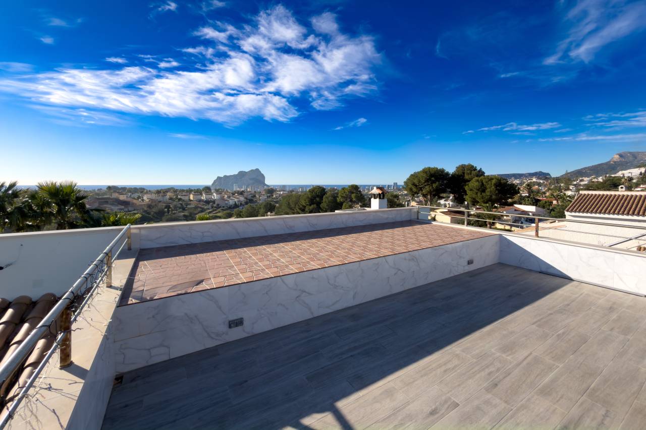 Esta villa de estilo mediterráneo en la zona de Gran Sol (Calpe) combina el diseño tradicional con una reforma integral moderna. Ubicada sobre una parcela de 898 m², destaca por su orientación sureste y vistas panorámicas al mar y al Peñón de Ifach.